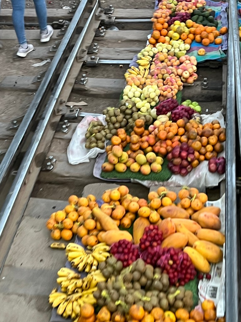 It has a market which must go on for about a mile selling absolutely everything. Much of this is situated on the railway track and what could not be whisked away we simply drove over including quite a lot of fruit!