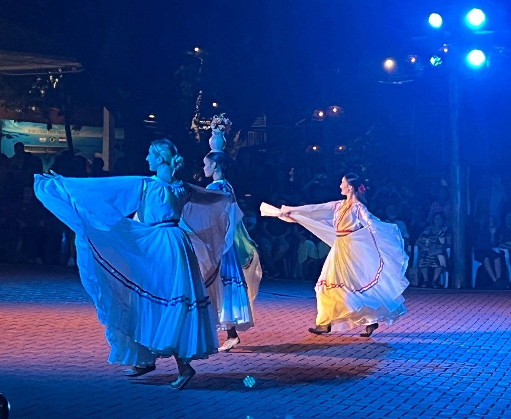 It was then on to the ‘cultural show’ presenting the history (I think) of dance in the three countries. The first section was rather amazing with two ballet dancers doing I’m not quite sure what, but impressive. This was followed by every genre of dance from each country including a lovely lady dancing with a series of flower-pots and then wine bottles on her head! We saw tango, samba, flamenco and also the Bahian dance and at last Capoeira, which I had failed to see in Salvador. However, it all had to stop half way through so everyone could have their photo taken with the dancers, which added half an hour! It finished with some incredible Samba making me ever more determined return for Carnival one day…
