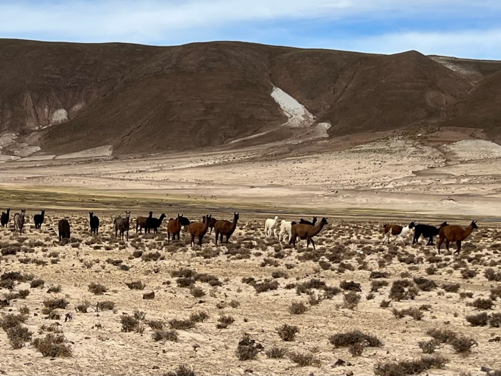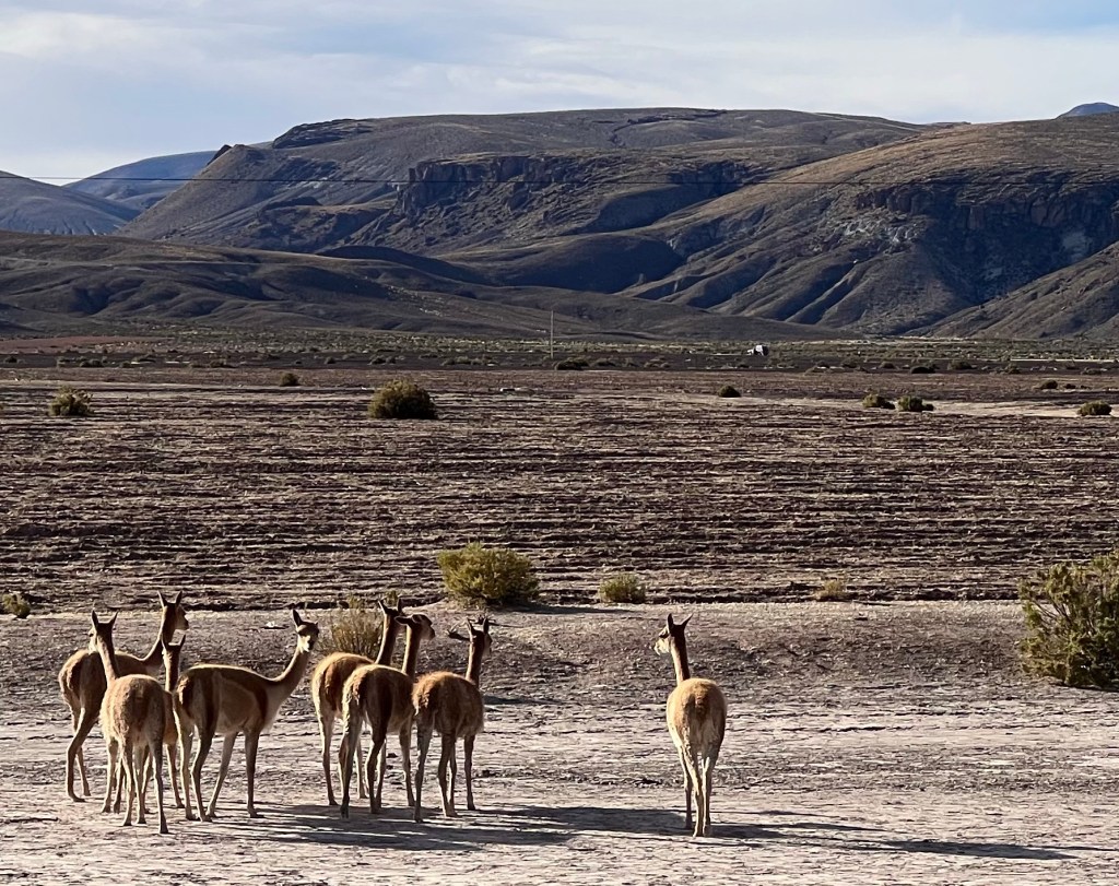As it was about 4.30 in the afternoon and obviously tea-time, we saw many of them in lines (caravans) coming across the plane led by their alpha llama – no dogs or horses rounding them up, they just make their way home on their own – quite sweet?