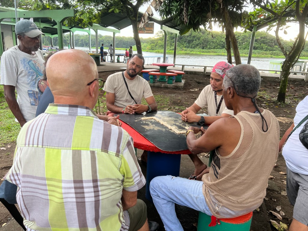 In the afternoon we joined the first staff shift on their homeward journey back to the local village. (I saw them arriving before 6am). Before heading into the village we watched a fascinating video on the turtle conservation programme here in Tortuguero, learning how the American, Archie Carr, had turned the industry around from poaching the turtles for sale for turtle soup and for their shells and eggs, to preserving them. This was largely achieved through education of the local communities and showing that long term, the turtles could bring them more income alive, than dead – ie through tourism. Which looking at the number of people there were in the little town, proved more than true. We joined them walking the length of the town past a very noisy and competitive game of dominoes and making one or two little purchases. The village is comprised of a variety of cultures: Hispanic, Miskito Indian (Nicaragua) and Afro-Caribbean. Both Spanish and Creole are spoken.