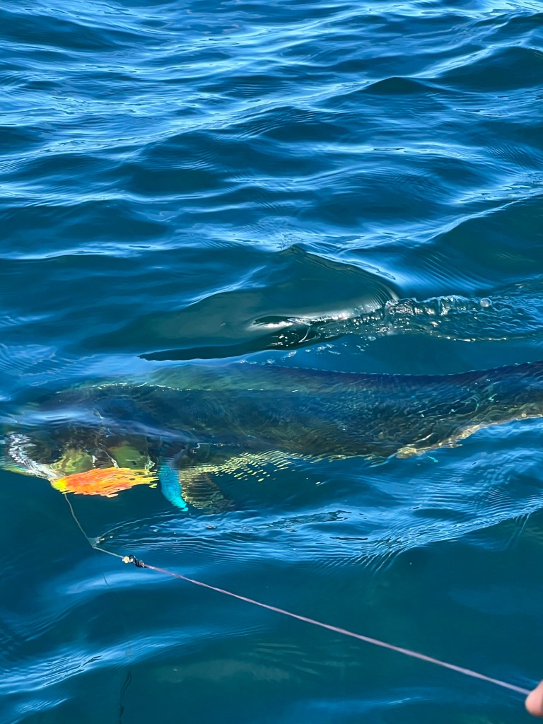 Ten or fifteen mins later we caught a second and it was apparently my turn – on with the ‘fighting belt’ and the heave started. Goodness it was hard-work, my admiration for fishermen went up tenfold, and with some help from Tim we landed a HUGE (to me!) mahi mahi. Nobel promptly requested a beer out of the cooler which he poured down the poor unfortunate fish’s throat – apparently this quickly kills it. Still there was a lot of flappin’ and a lota lota blood.