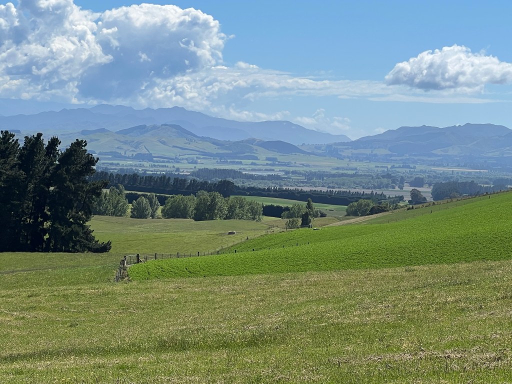 Another beautiful day and Susie took us on the most stunning drive over to her youngest son, Beau’s farm. Indescribably beautiful with Shield property as far as you could see. From the top we could see where Sam and Henry farmed. The rolling landscape is so very different from Chid’s farm, just a few hours north, with its rugged mountains, covered in trees. The farming is more intensive here with a focus on meat production and thus a certain amount of drilled land to feed the stock. Chid’s stock had to be self-sufficient with no extra food or water, his emphasis being on wool production from his Marino sheep (for Icebreaker), plus his diversification into Manuka honey.