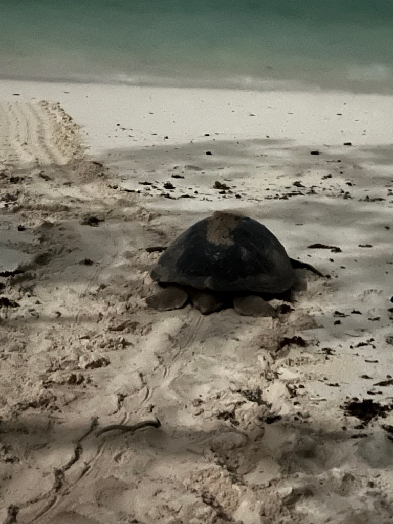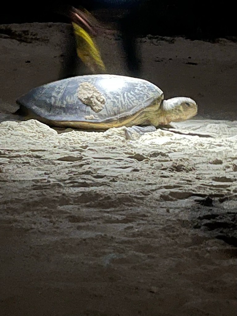 After supper we went on a turtle-nesting walk with Mossie which was very special. We saw several turtles coming up the beach and he took us right up to the nests where the mothers were nesting and we even saw one laying the last of her eggs, covering them up and heading back to the water. Once again we learnt so much … turtles reach sexual maturity when they are about 30 with only 1 in 1000 hatchlings reaching this stage of life. When they are fat and strong enough, they will return, often from several thousand miles, to the vicinity where they were born. They mate with several males and store the sperm, which all gets mixed up and used to fertilise several clutches of eggs.