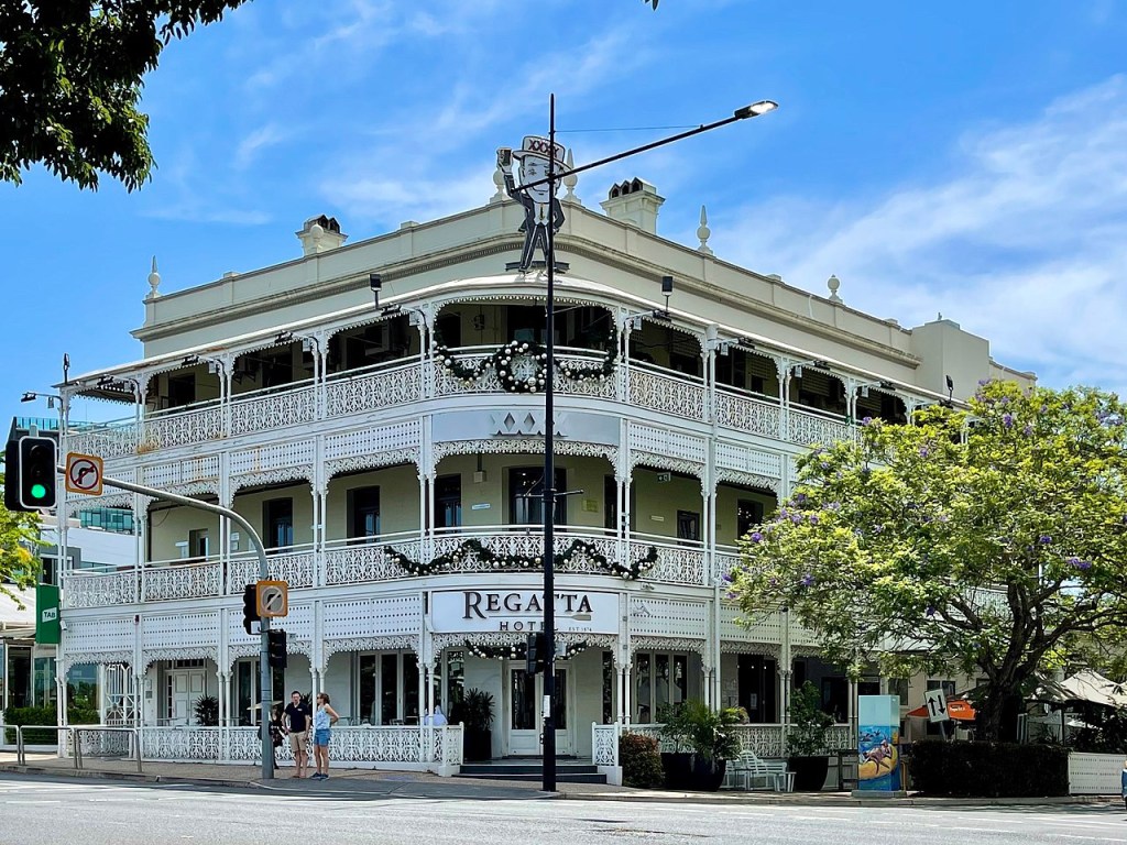 There was an interesting gas-tower (apparently built in Yorkshire in 1912 and transported in segments to Brisbane) and a few historic houses; perhaps the most interesting being the Regatta Hotel which is rather beautiful and dates back to 1886. It is still run as a hotel having survived several fires and major floods (one going up to the third storey with people tying their boats to its 3rd floor balcony). It is also where a protest by women, in 1965, resulted in women being permitted entry into a bar – this had been prohibited in Queensland until this time! Brisbane sits on a flood plain and has suffered many serious floods, the most significant in 1893 and more recently in 1974, 2011 and 2022 – perhaps the reason for so few historic houses?