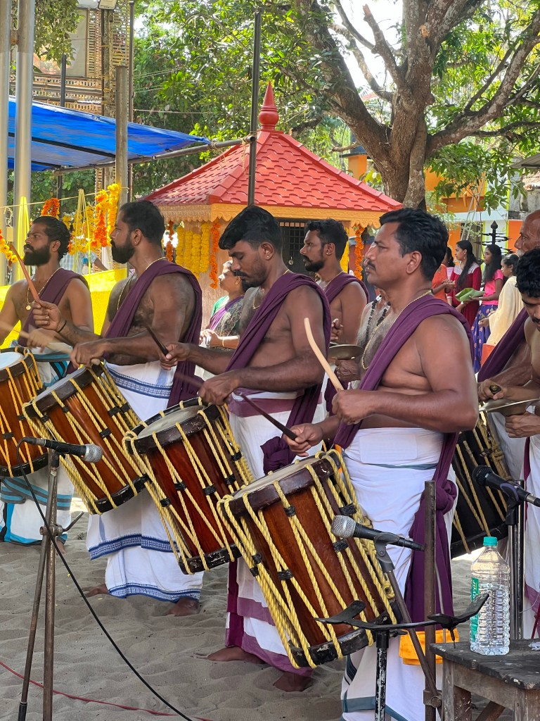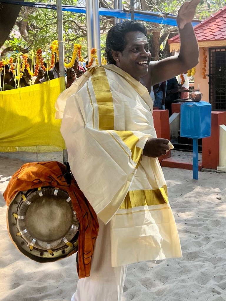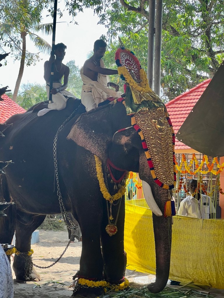 Just for a nice change, there was a festival going on to celebrate the opening of a new temple in the village – there are already 16! Anyway huge excitement, everyone was there from 90 to nine months, all dressed up and bringing their offerings to be blessed by the Brahmin. There were drummers and a guy playing another amazing looking instrument, like a giant oboe, three elephants in full regalia (shackled – hate that – but with lots of food to eat). Analida and I were the only tourists and were not convinced we should have been there, but once again we were drawn in and invited to sit down with them. I am not sure, if we were more of a curiosity than they were and we had to have endless photos taken with them all. They really are the loveliest and most friendly people possible.