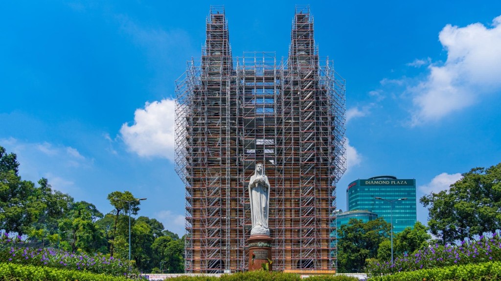 We had a couple of hours to fill before we could check back into our hotel, so went to have a quick look at Ho Chi Minh’s famous Notre Dame cathedral, though unfortunately found it under restoration and covered in scaffolding. Although built by the French (1863-1880), it bares only a vague resemblance to its beautiful namesake in Paris. It has a rather stunning statue of the Virgin Mary in front of it, which in 2005 was reported to have shed a tear, attracting thousands of devotees to the city, however the Catholic Church could not confirm this.