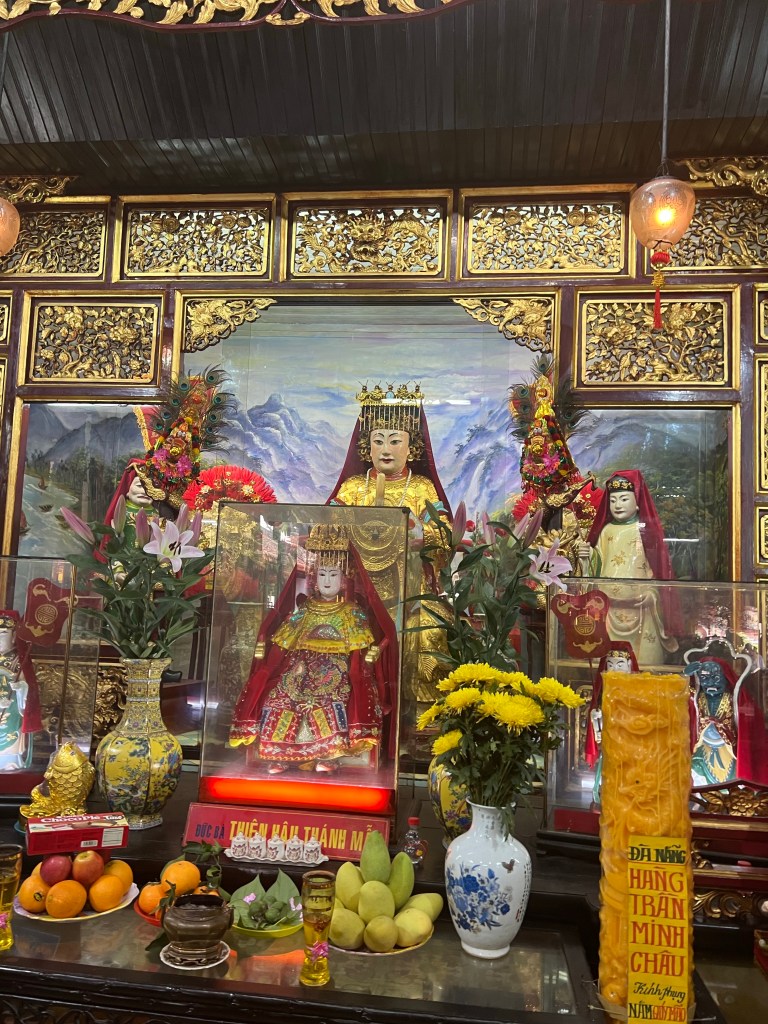 They also come to worship a god called Thien Hau (Mother of the Ocean) who blesses fishermen and sailors whilst at sea. She has two, rather scary looking, assistants, one with bulging eyes who can see for a 1,000 miles and the other, also with pretty bulgy eyes and huge ears, who can hear for 1,000 miles and keep them safe. Or there was a spirit you could pray to if you needed help with your business, though the success of this very much depended on your karma and how good and honest you had been. Also a spirit to pray to if you were struggling to get pregnant. She had twelve assistants who would each watch over your baby for a month. On the baby’s first birthday, there would be a celebration and it would be presented with a number of ‘tools of different trades’ and whichever one the baby went to would be their chosen profession and the parents would guide them in that direction.