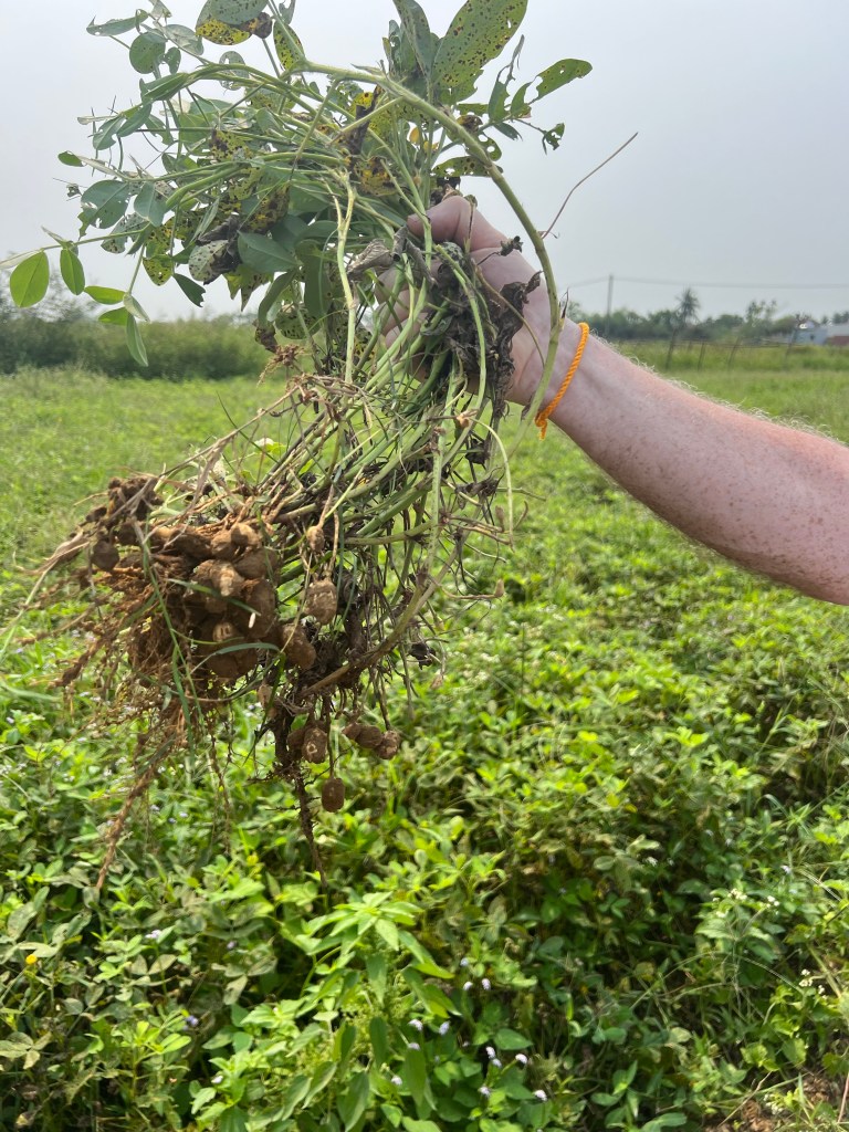 The rice farming is all done by hand here and at this time of year, the farmers are out at first light to collect all the snails which might be munching their crop, which needless to say they also eat! They had a simple but effective irrigation system of concrete channels from the river with covered holes into the fields. The hundreds of doors, covering the holes, have to be removed one by one, by hand twice a day. A field of peanuts was ready to harvest, indicated by their yellow flower. Again harvested by hand, literally pulling up the route where the peanuts lies – confession …. I thought they grew on trees!