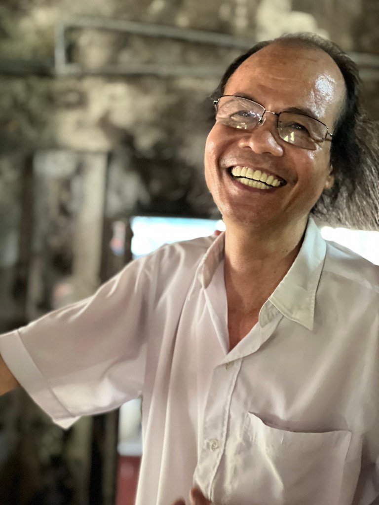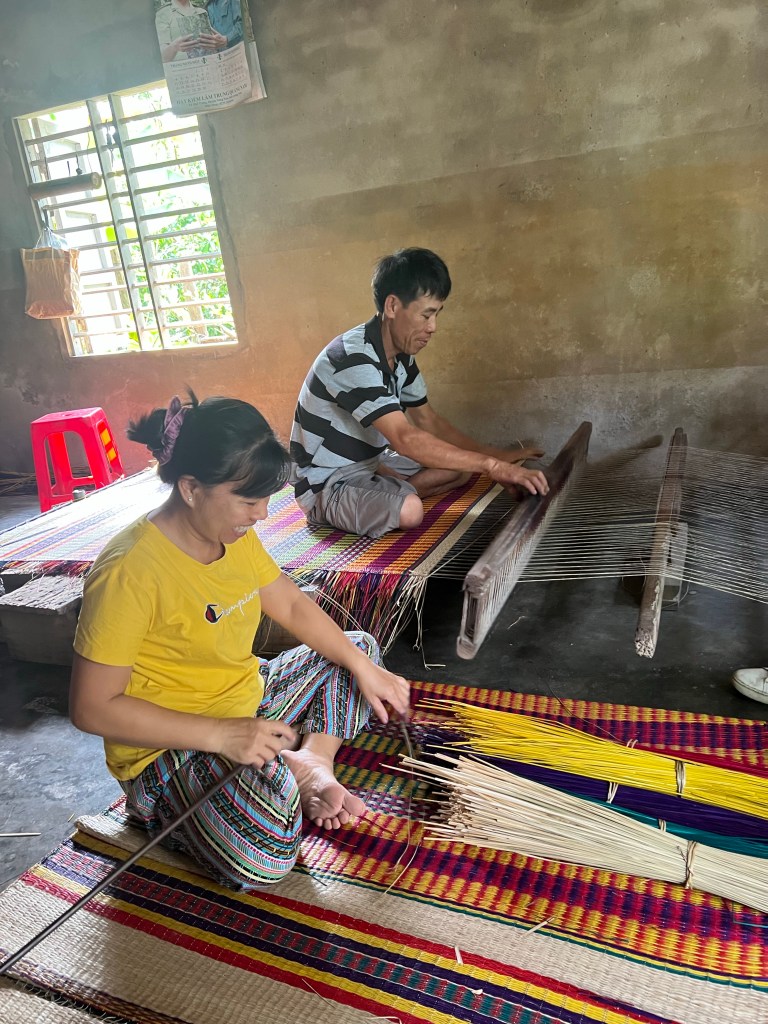 Our first visit was to a weaver making colourful sleeping mats from local reeds. We met a wonderful couple who had been sitting on the floor together weaving mats for 45 years – it was much harder than it looked and back breaking work which they were doing at incredible speed. They could create a sleeping mat in just four hours, but only sell it for $4 – that is 50 cents an hour each. This couple grew their own reeds and dyed them in huge vats, leaving them out on the road in the sunshine to dry. They had recently built a second storey on their house, but still had their little coconut basket boat tucked above the beams for emergencies. Man explained that most rural people would still sleep on a mat, and indeed he did himself. They are very personal and prized items, which you can fold or roll and carry anywhere, lasting twenty or thirty years.