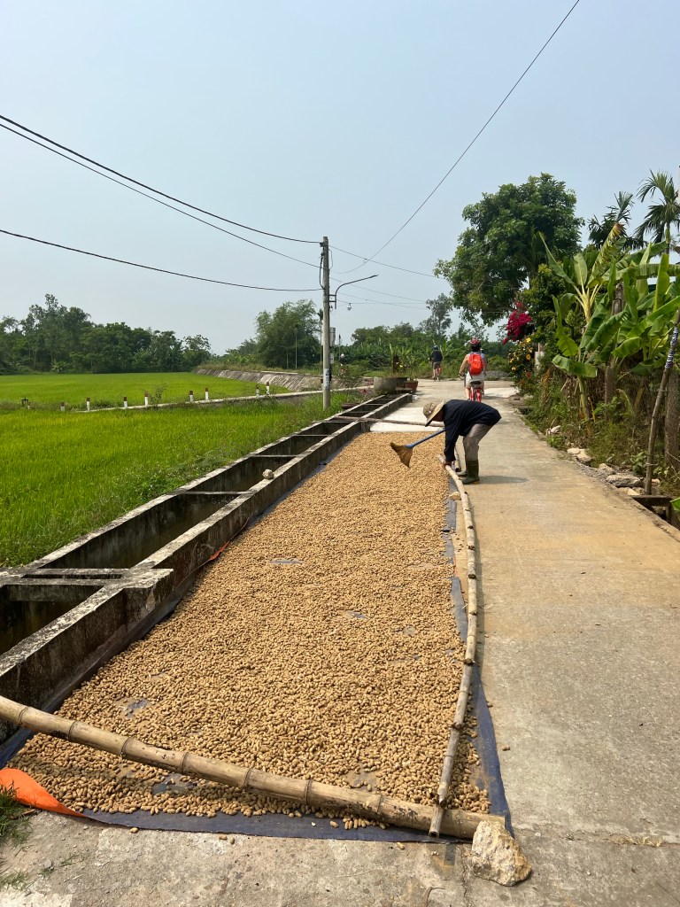 As we cycled on, we had to avoid many houses with reeds drying in front of them on the side of the road, so competition must be high. There were also masses of peanuts drying in the sun, on the side of the road, which is not wide anyway!