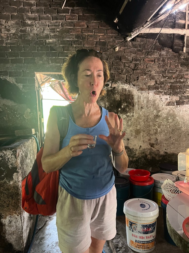 Next stop was the rice wine distillery. This used a similar process to the distillery we saw in Laos, but took place in our host’s house who boasted a sustainable process even producing his own methane from the most adorable group of inquisitive pigs, at the back of his house. The rice is again cooked and then laid out on a tray of palm leaves to cool. He sprinkled this with yeast and mixed it by hand. It is then put into a large plastic bucket where it ferments for three days. Water is then added and it is then boiled, using the piggy methane and the condensation cooled over a tank of cold water and collected. Depending on the process, 5kg of fermented rice can produce up to a litre of 50-60% alcohol. Again snakes can be added or our friend was also keen on centipedes.