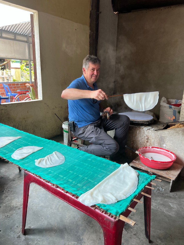 We peddled on, somewhat wobbly after our rice wine, to our last lesson of the day …. noodle-making. Another group was in front of us, so we started off by having a rather tasty pork noodle soup with the most delicious sweet chilli jam (would have been TEC’s best!), and then we tried our hand at making them. Once again noodle-making is a true labour of love, and would be made fresh every day. Our hostess, An, is up at 4am to make her 70kg of noodles, before all the tourists arrive.