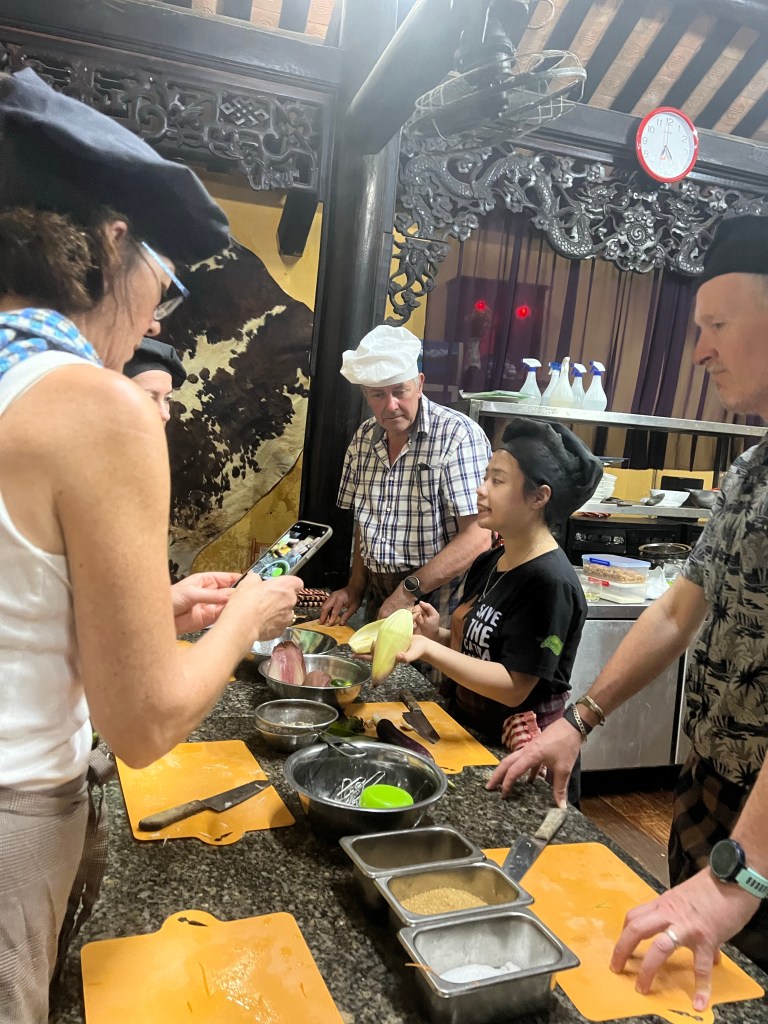 In the evening, five of us had signed up to do a cooking class …. and being such a keen cook, this obviously include me. Adorable Jam was our teacher (looked about twelve!) and took us up to her strip of a kitchen with two little camping stoves, with three gas rings and four very dented saucepans, five chopping boards and five nice sharp knives. She was incredibly professional and in an hour and a half she had guided us through making a five course dinner! Fresh vegetable spring rolls, yummy beef, noodle and herb soup, banana flower and green papaya salad, aubergine and noodle salad and for pudding mango/coconut sticky rice, which we then happily ate. It was delicious and although it was all done in a higgledy piggledy order, so not sure I could replicate, we learnt some really interesting things, particularly about using herbs and spices. I think they are more potent than ours, but it is amazing the difference they make. It was fun.