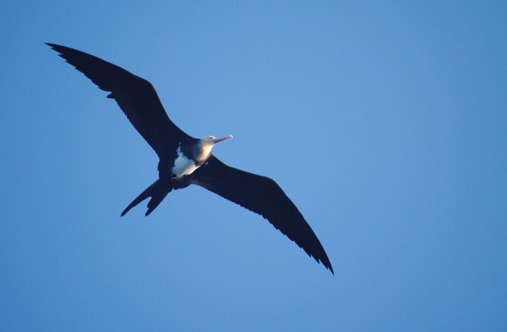- Frigate birds – have hollow bones and weigh less than a kilo; they are not very waterproof and don’t have webbed feet, so are poor swimmers/divers. They prey on the poor unfortunate boobies, chasing them until they drop their catch.
